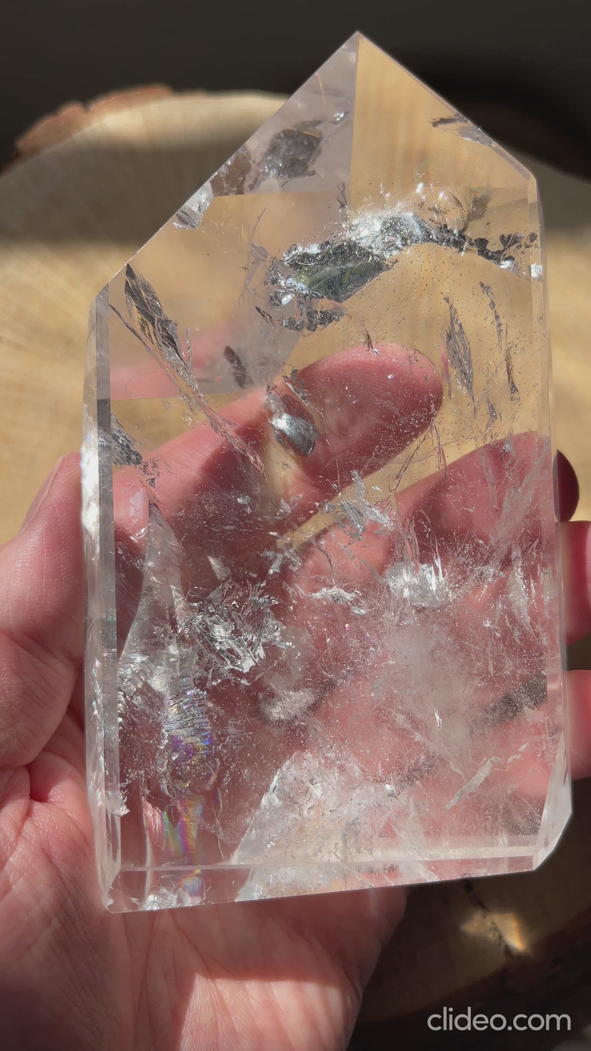 • Regenbögen: Das schöne Designstück hat viele wunderschöne Regenbögen, wenn man ihn gegen das Licht hält. Der Bergkristall ist in der Realität noch schöner!