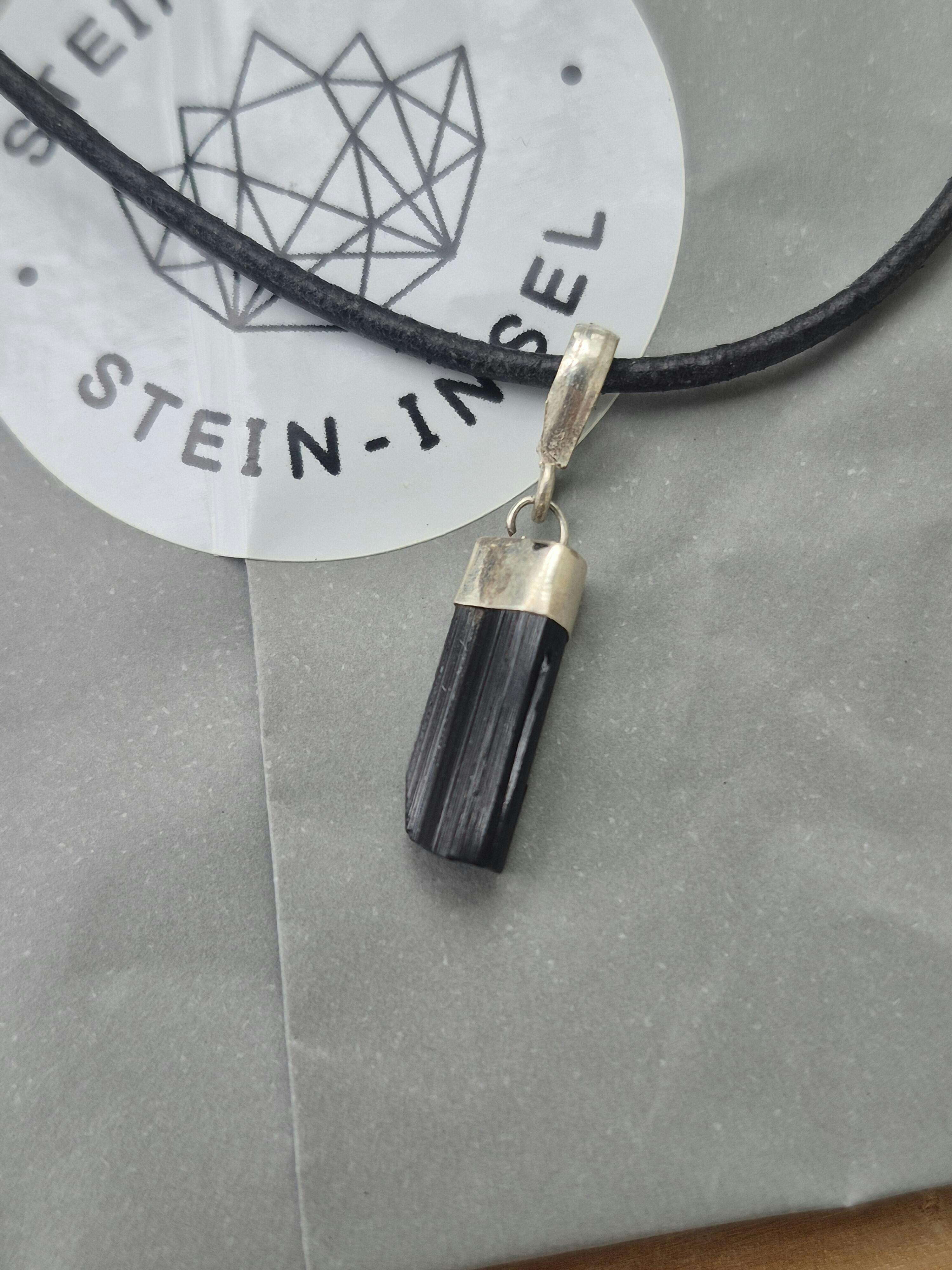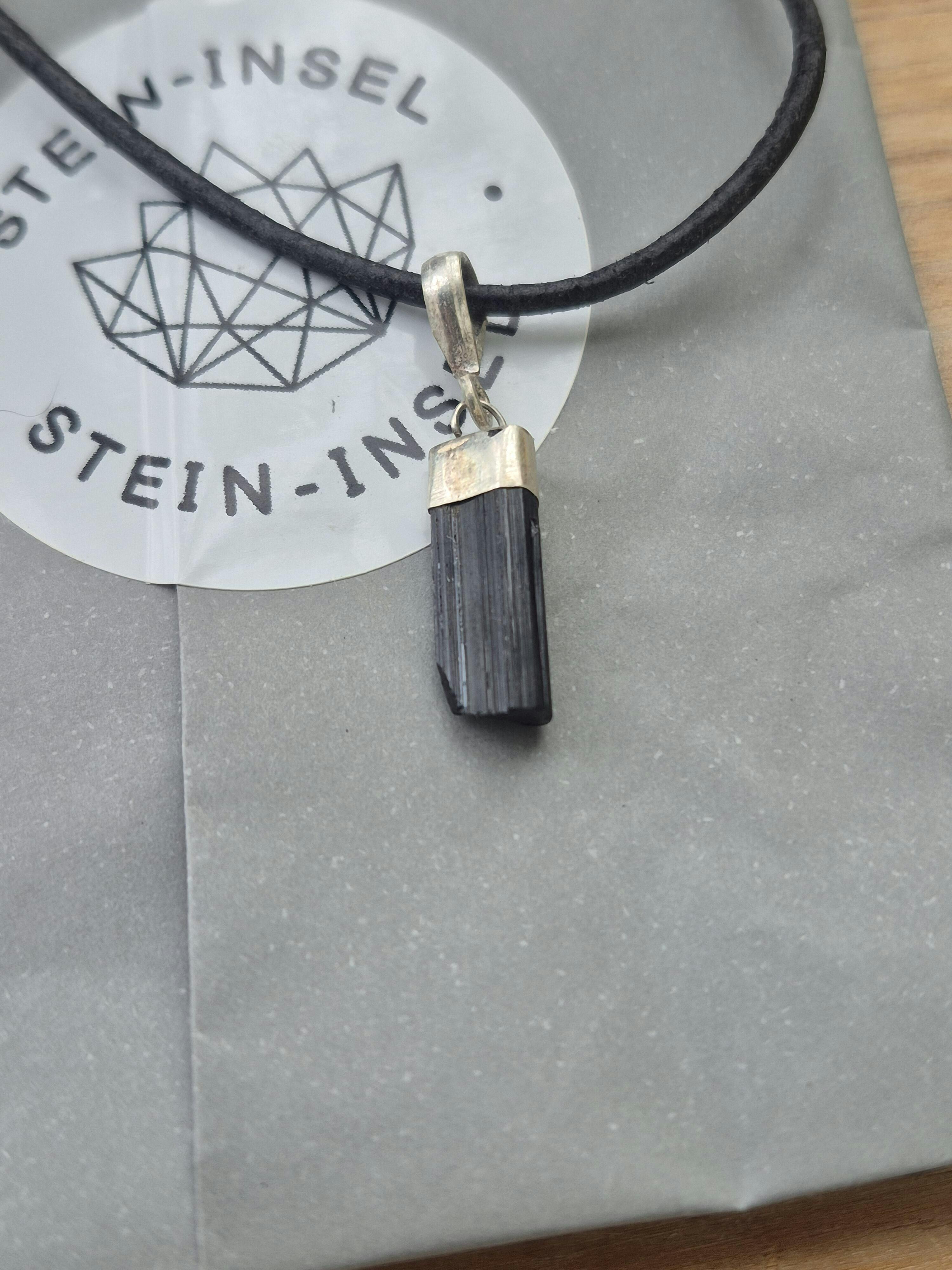 Schwarzer Turmalin mit 925er Silber & Lederband